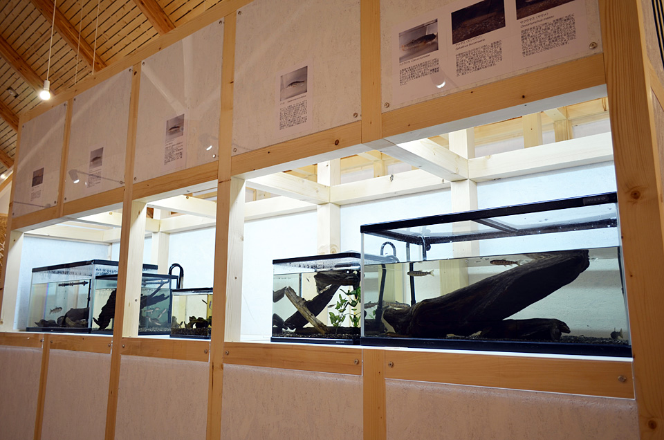 - 糠平湖や音更川水系の河川などに生息する魚類や水生昆虫を中心に、東大雪地域の生物を生きたまま展示しています。夏季はクワガタなどの昆虫も展示しています。
